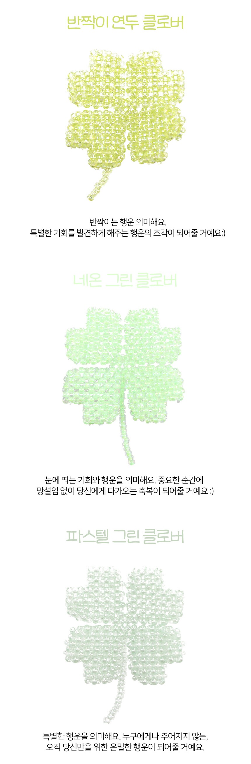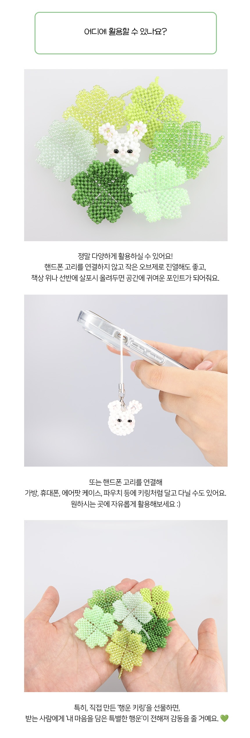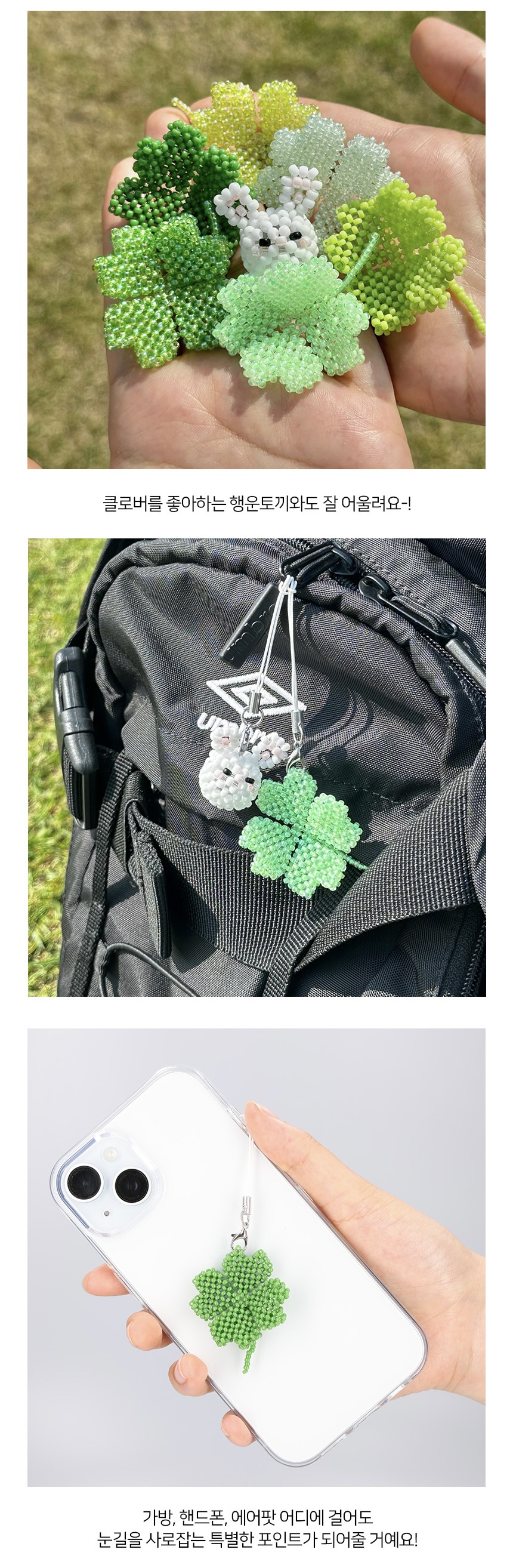 초록, 연두, 반짝이 초록, 반짝이 연두, 네온그린, 파스텔 그린 총 6가지의 다양한 초록빛으로 구성되어 각기 다른 의미의 행운을 담아냈어요. 가방, 파우치, 에어팟 등에 가볍게 달아주면 확실한 행운 포인트가 되어줄거예요. 행운이 필요한 누군가에게 선물하기에도 참 좋답니다.