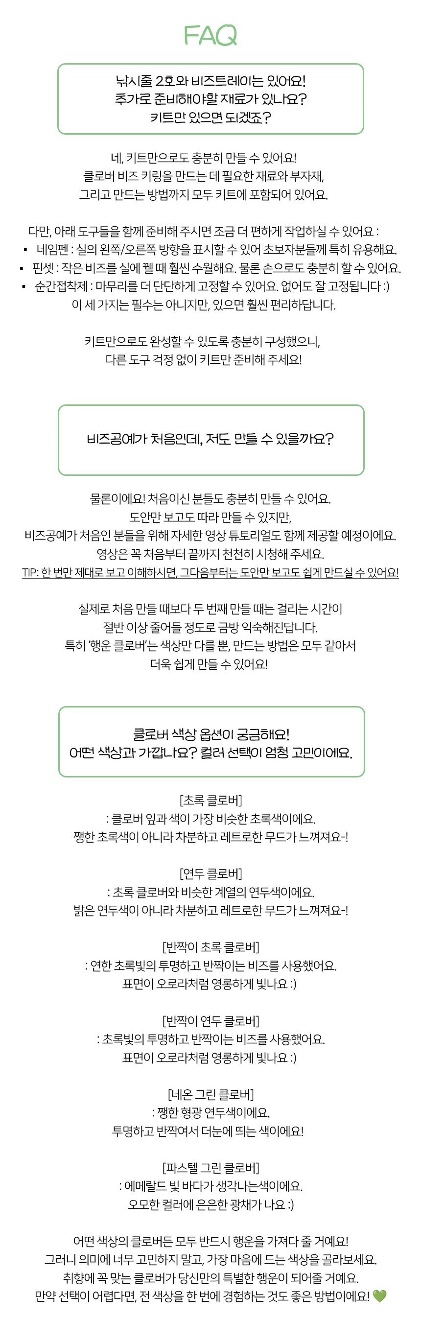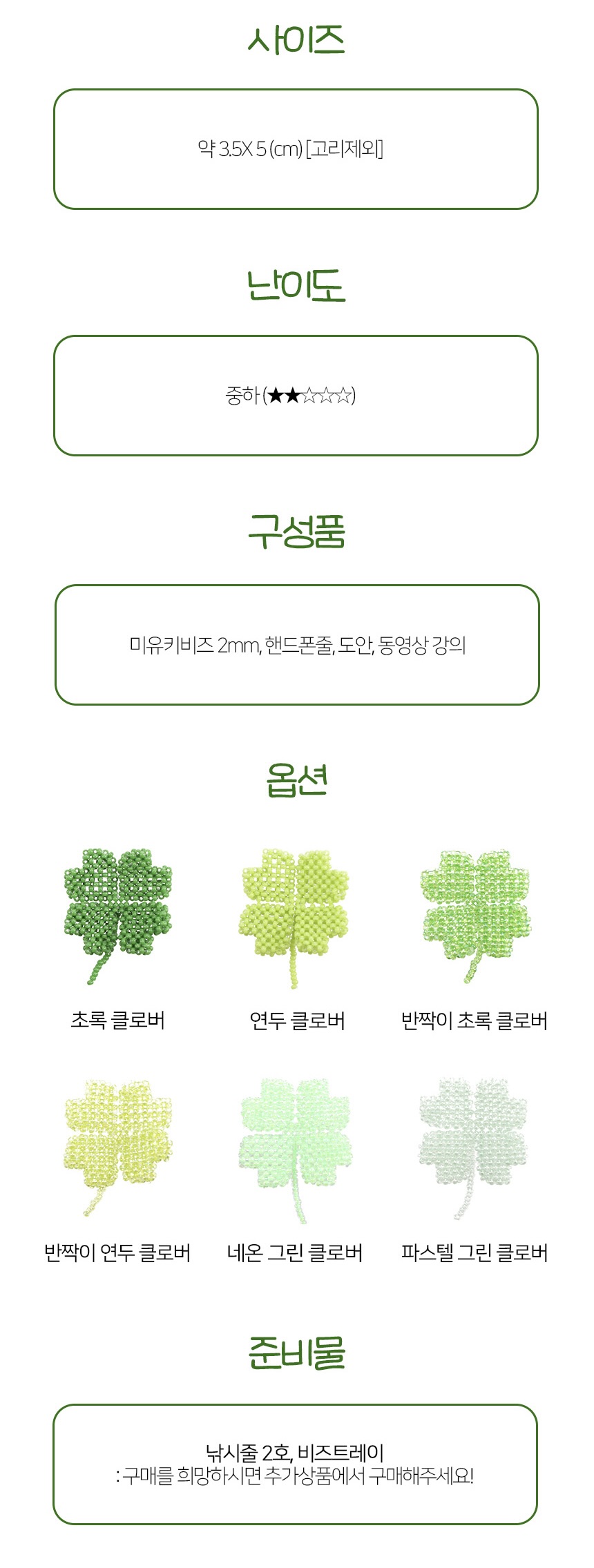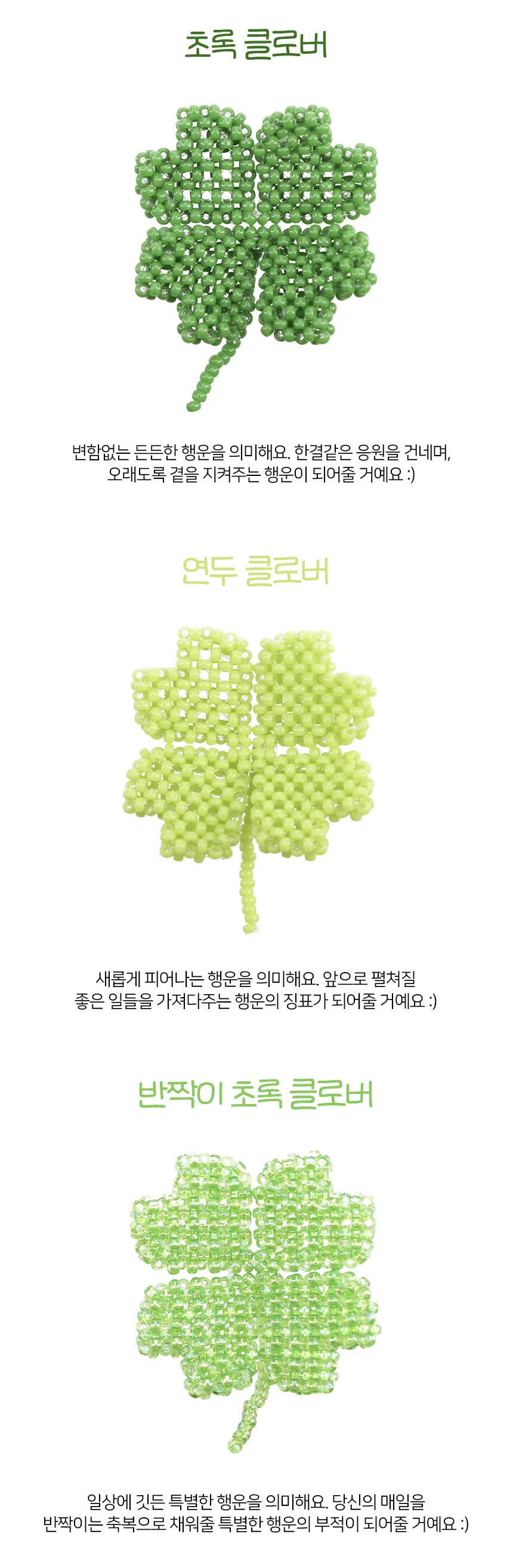 초록, 연두, 반짝이 초록, 반짝이 연두, 네온그린, 파스텔 그린 총 6가지의 다양한 초록빛으로 구성되어 각기 다른 의미의 행운을 담아냈어요. 가방, 파우치, 에어팟 등에 가볍게 달아주면 확실한 행운 포인트가 되어줄거예요. 행운이 필요한 누군가에게 선물하기에도 참 좋답니다.