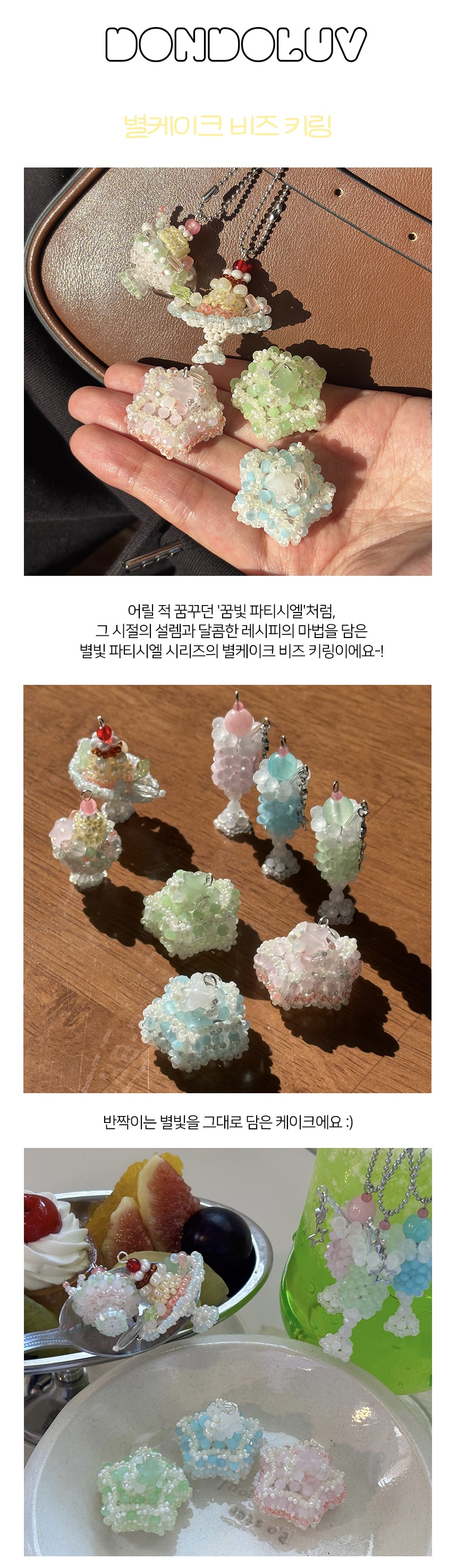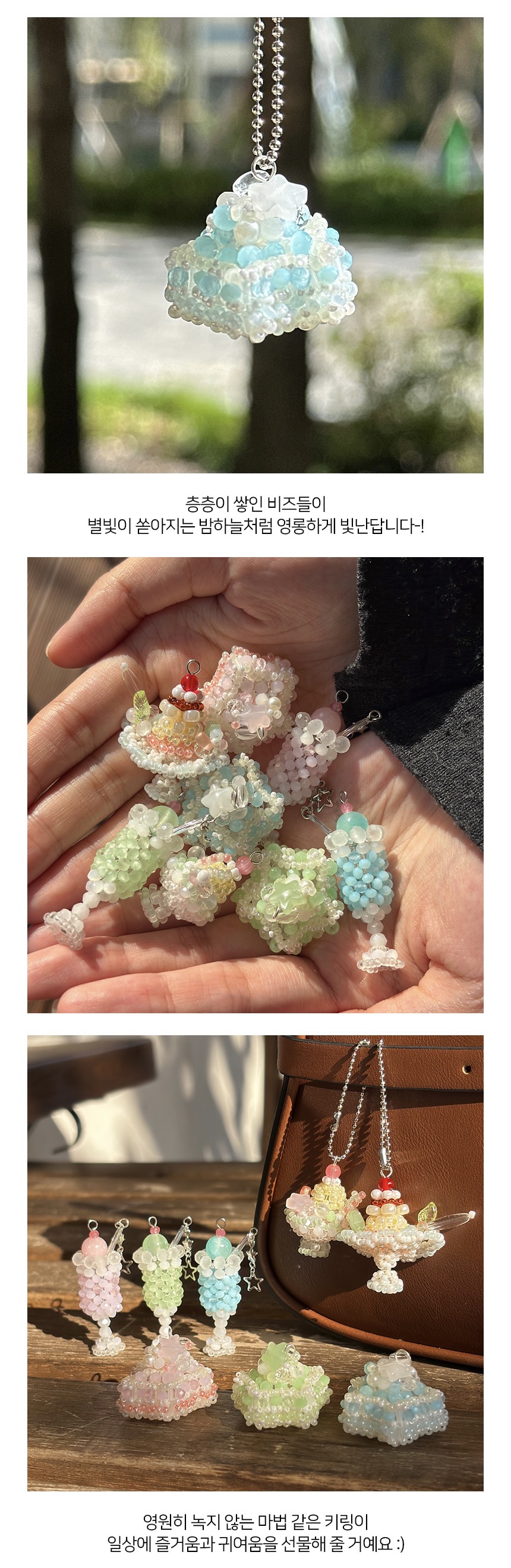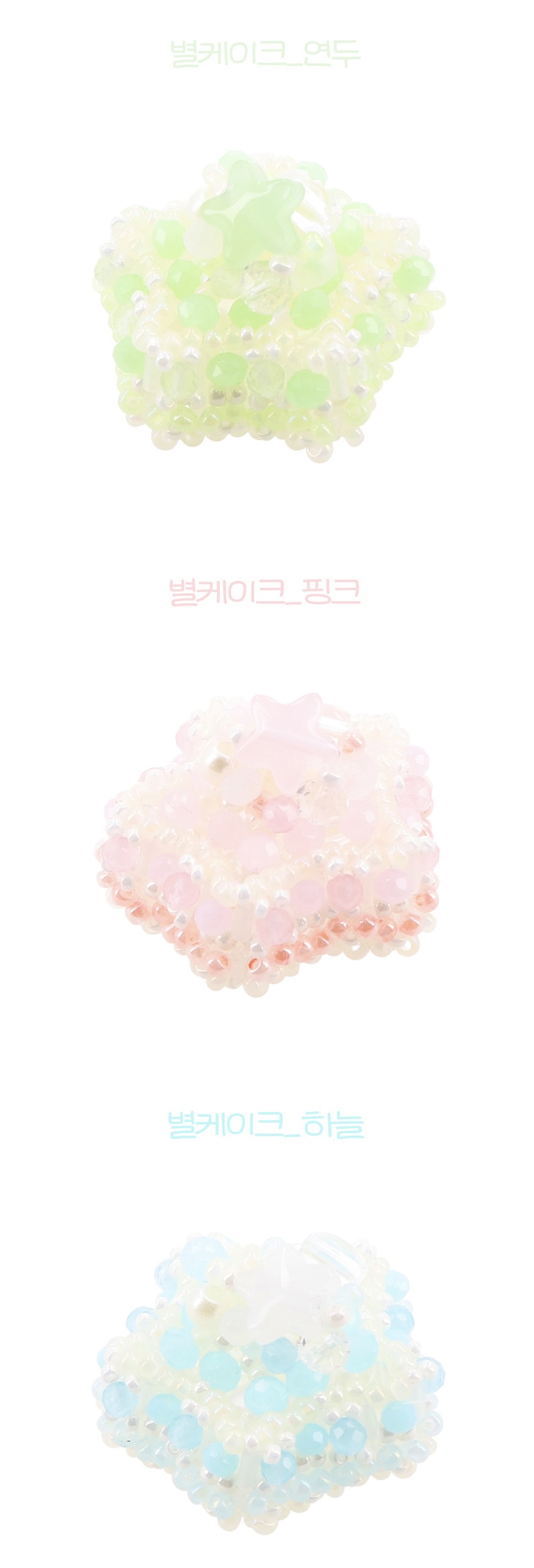 별 모양 파츠와 투명·오로라 론델 비즈가 빛나는 포인트가 되어주고, 파스텔 톤 생크림과 빵 비즈가 어우러져 달콤하고 사랑스러운 분위기를 만들어줘요. 작은 진주 비즈와 스프링클 디테일로 반짝임까지 더해, 보는 순간 특별함이 느껴지는 아이템이에요.