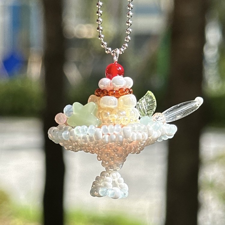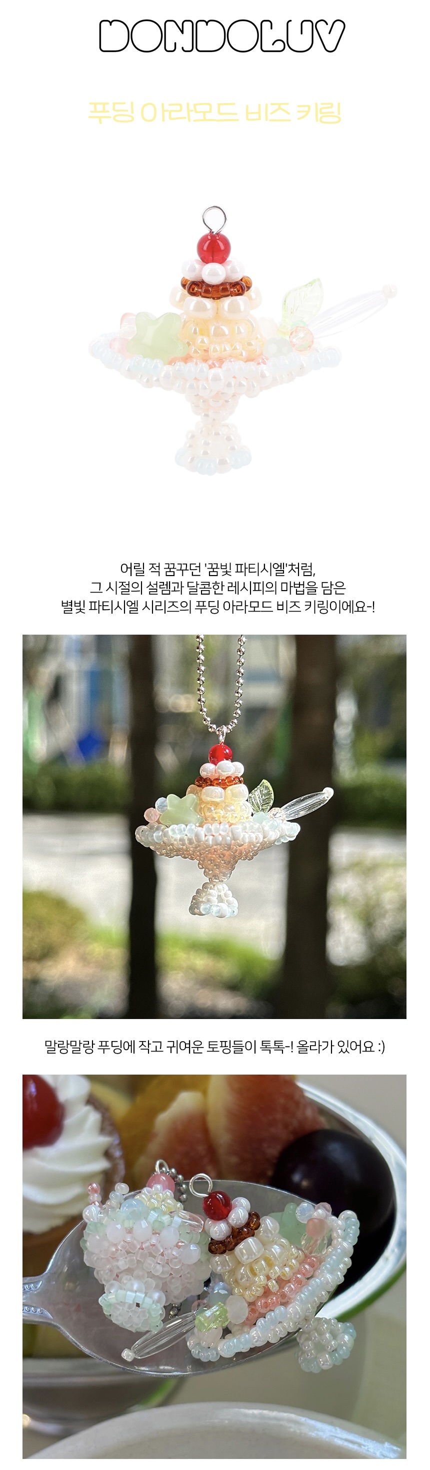 말랑말랑한 푸딩 위에 작고 귀여운 토핑들이 톡톡 얹어진, 푸딩 아라모드 비즈 키링이에요.
