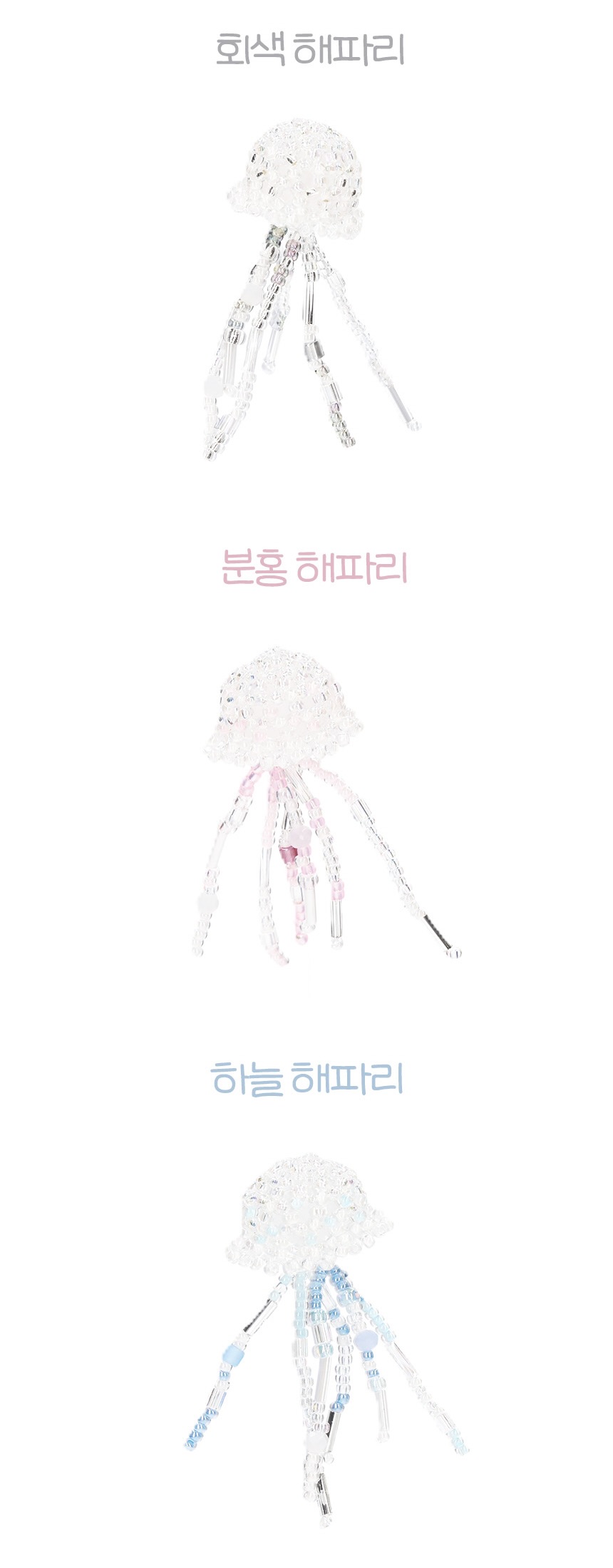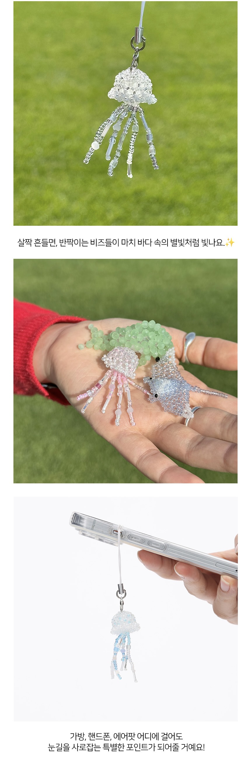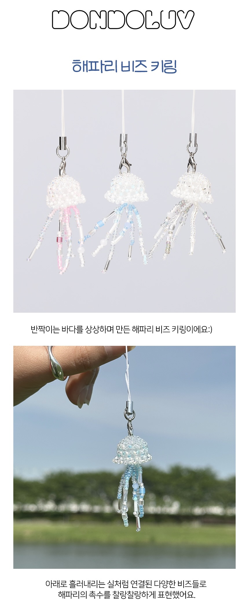 반짝이는 바다를 상상하며 만든, 해파리 비즈 키링입니다. 투명한 몸체에 알록달록한 촉수 비즈들이 어우러져 살짝 흔들기만 해도 반짝이며 더욱 예쁘게 빛나는 게 매력이에요.